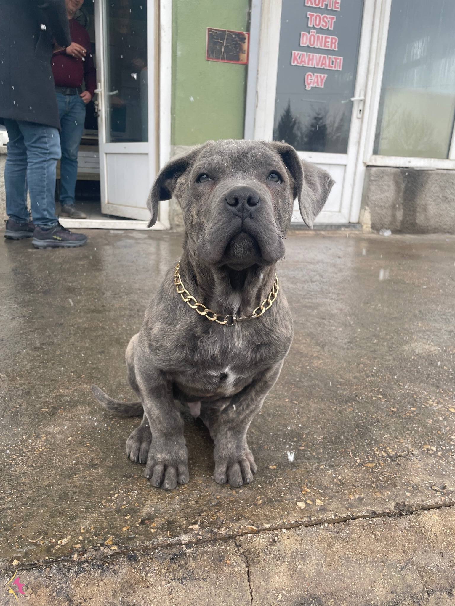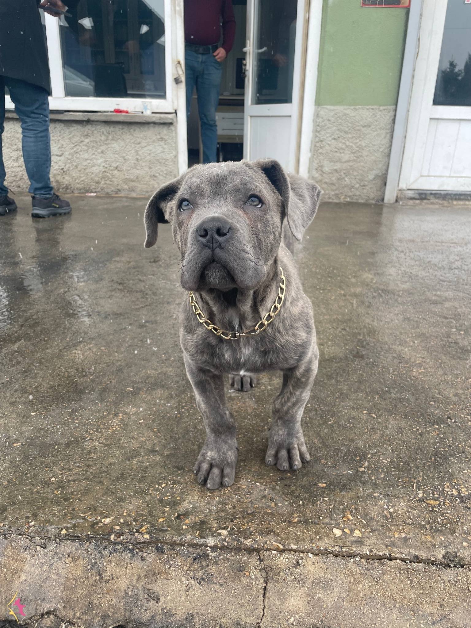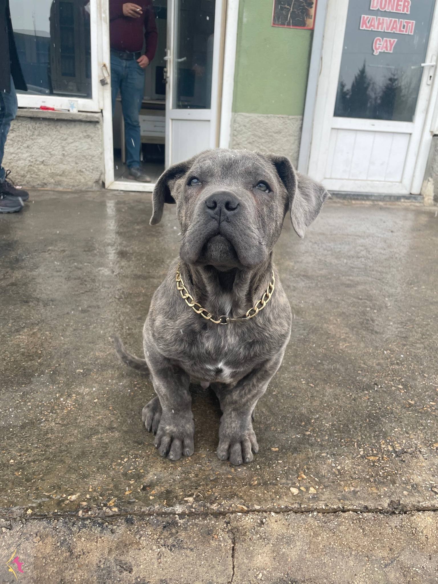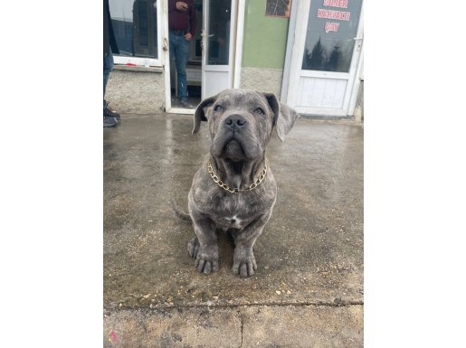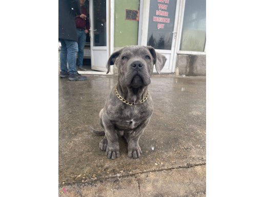 Ankara Sincan bölgesindeki üç aylık Cane Corso yavrumuz gündüzleri sanayi ortamında insanlarla iç içe, geceleri ise bahçede gelişerek sosyal ve özgüvenli bir karakter kazandı. İç ve dış parazit uygulamaları yapılmış olan minik dostumuz, fiziksel olarak oldukça sağlam ve dirençli bir yapıya sahip.