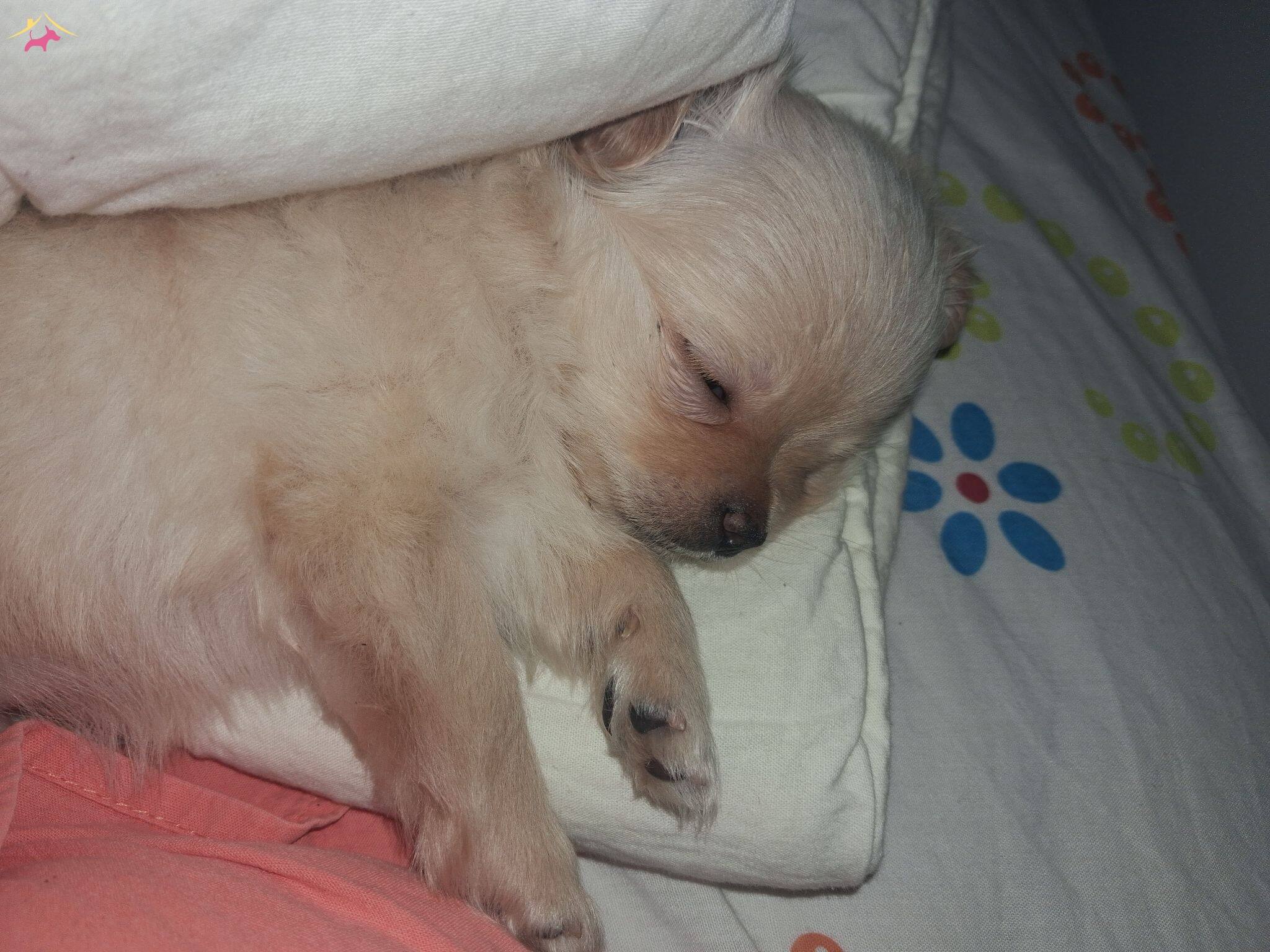 Pamuksu beyaz tüyleri ve huzur veren sakinliğiyle büyüleyen bu 4 aylık Chihuahua, sosyal ortamlarda tüm bakışları üzerinize çekecek gerçek bir ikonik dost.
