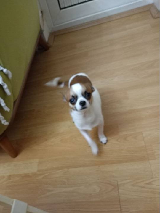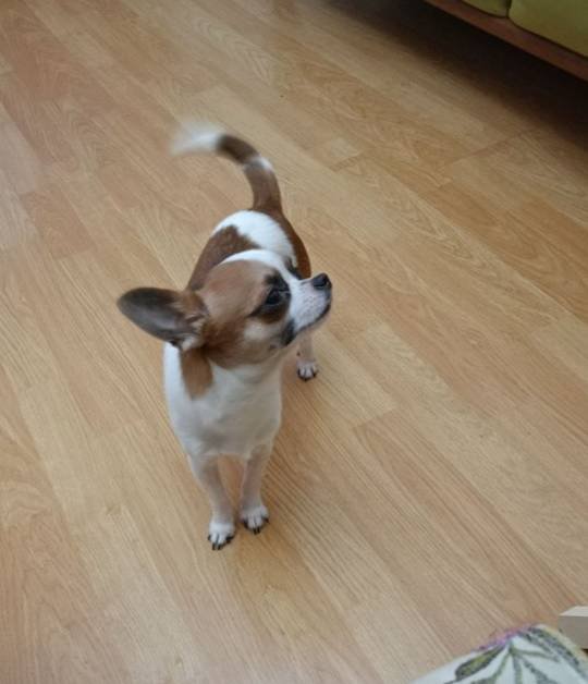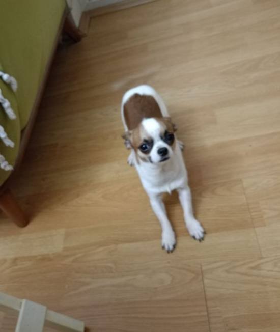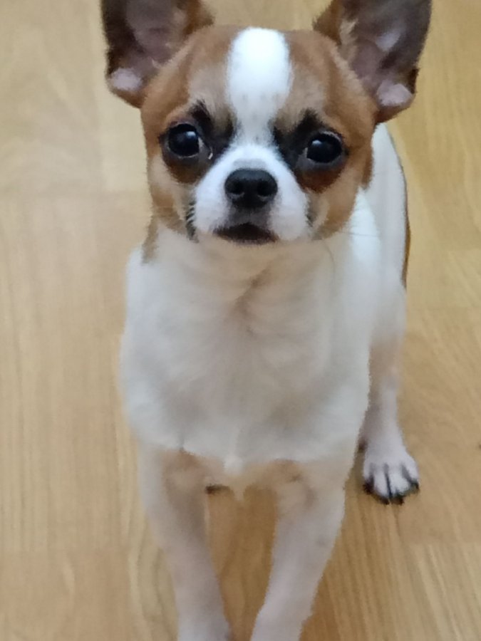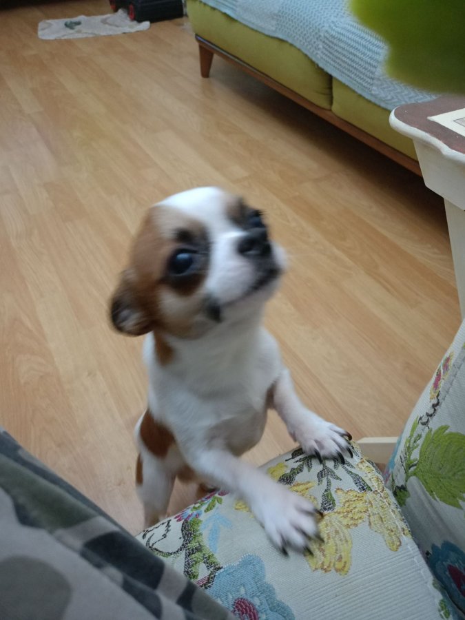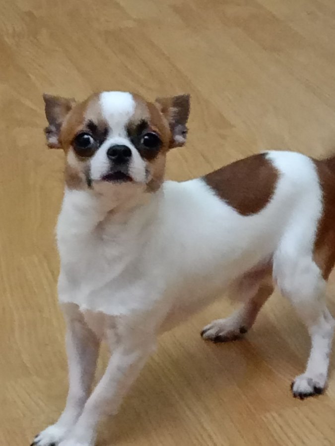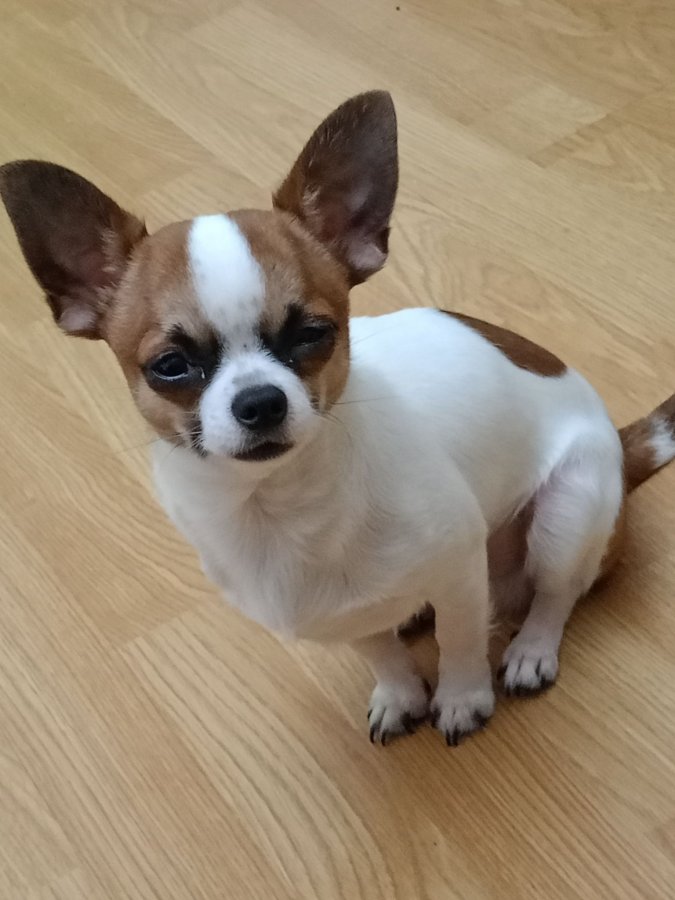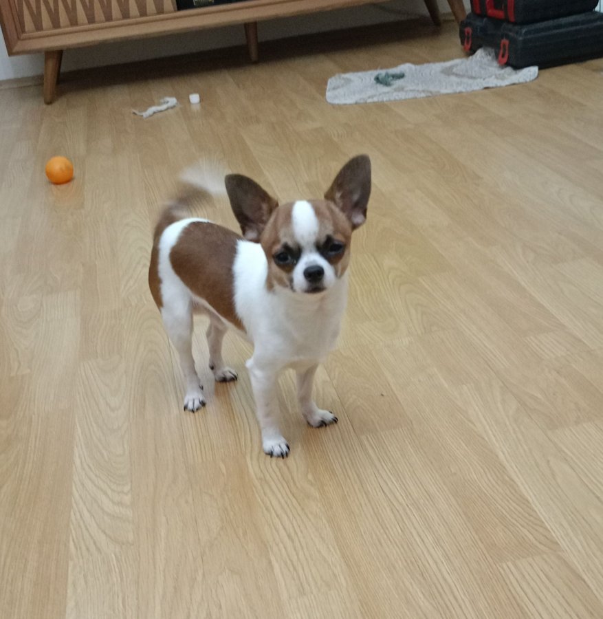 6 aylık pırıl pırıl beyaz karamel tüyleriyle bu Chihuahua tam bir neşe pınarı.