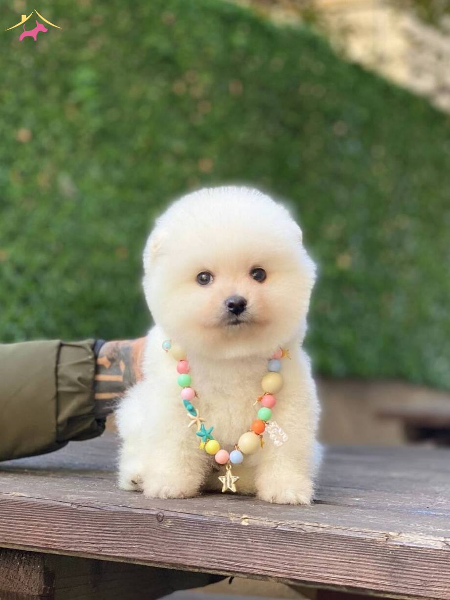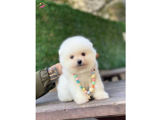 Ayıcık suratlı Pomeranian Boo yavrularımız, ipeksi beyaz kürkü ve minicik yapısıyla yeni yuvasına hazır.
