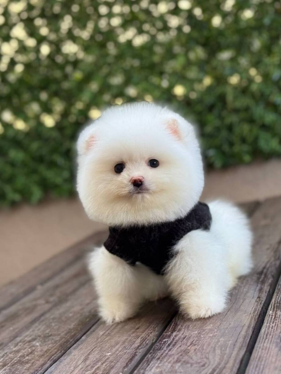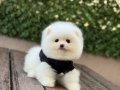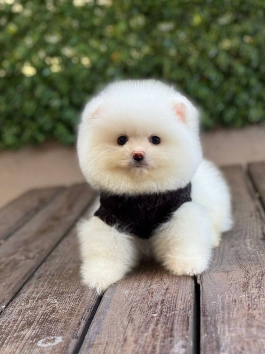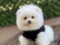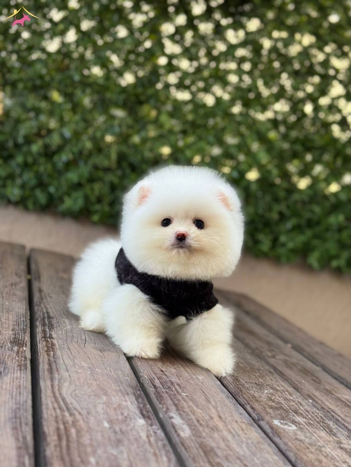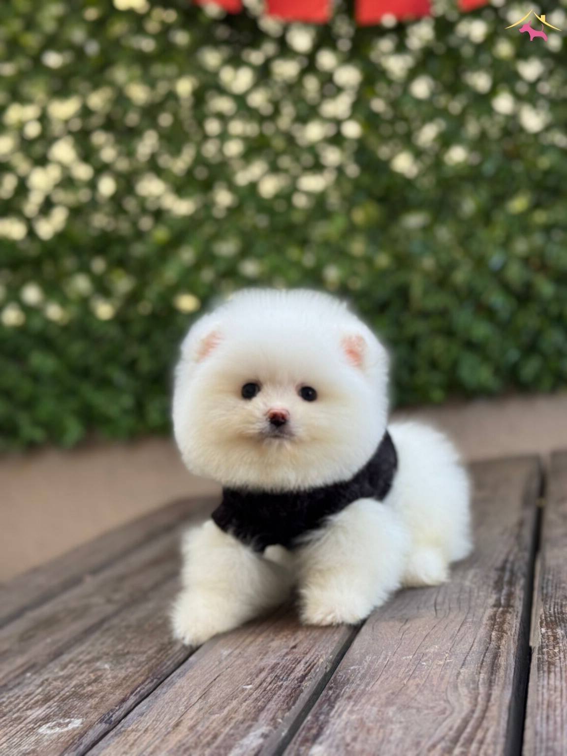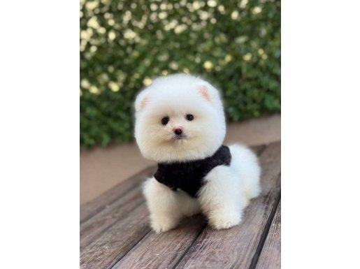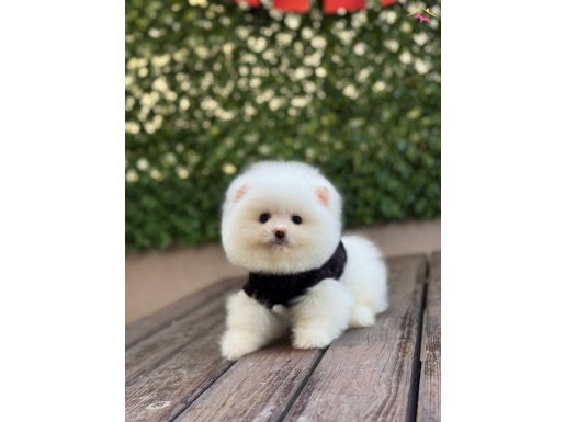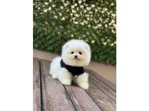 Kar beyazı tüy yoğunluğu ve basık burun yapısıyla tam bir ayıcık surat formuna sahip olan bu 3 aylık Pomeranian yavrumuz