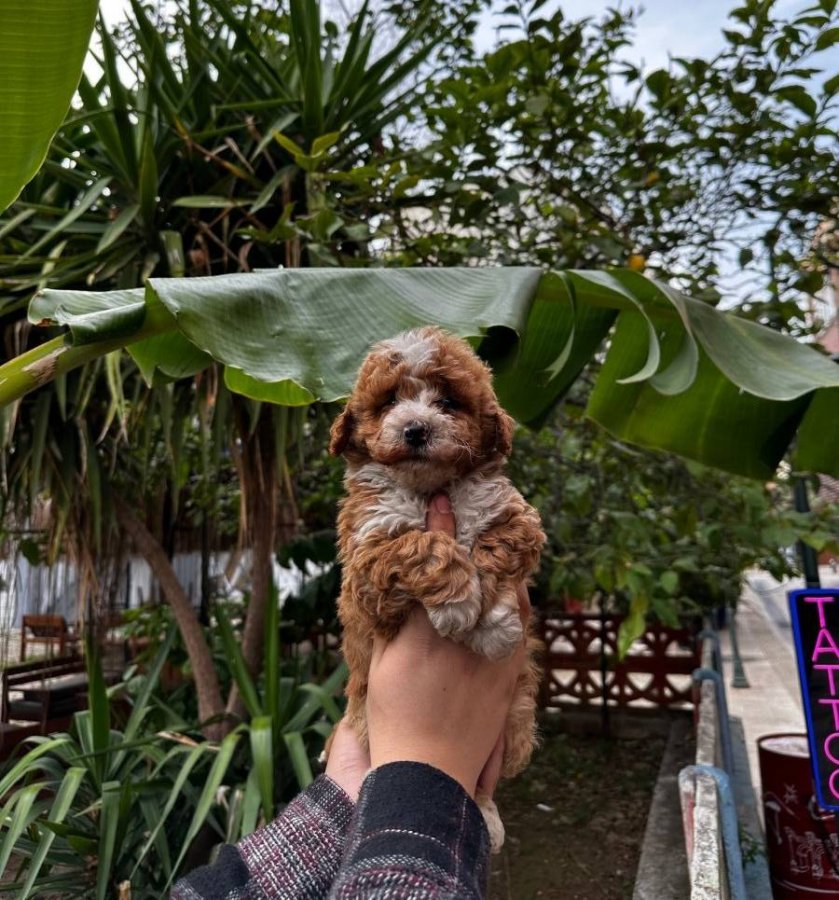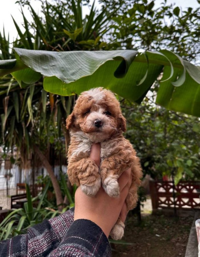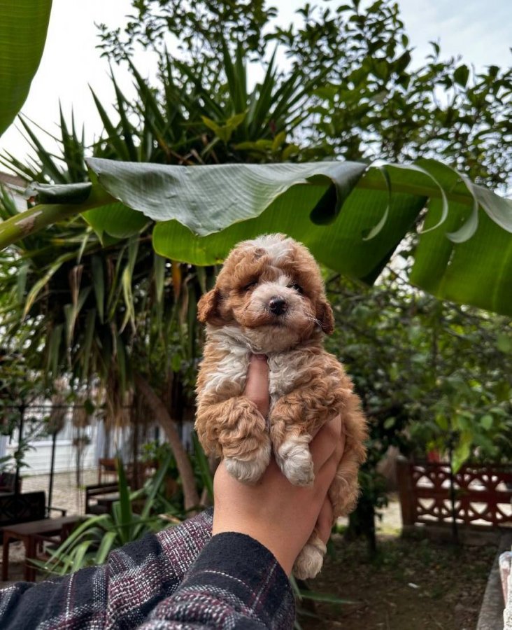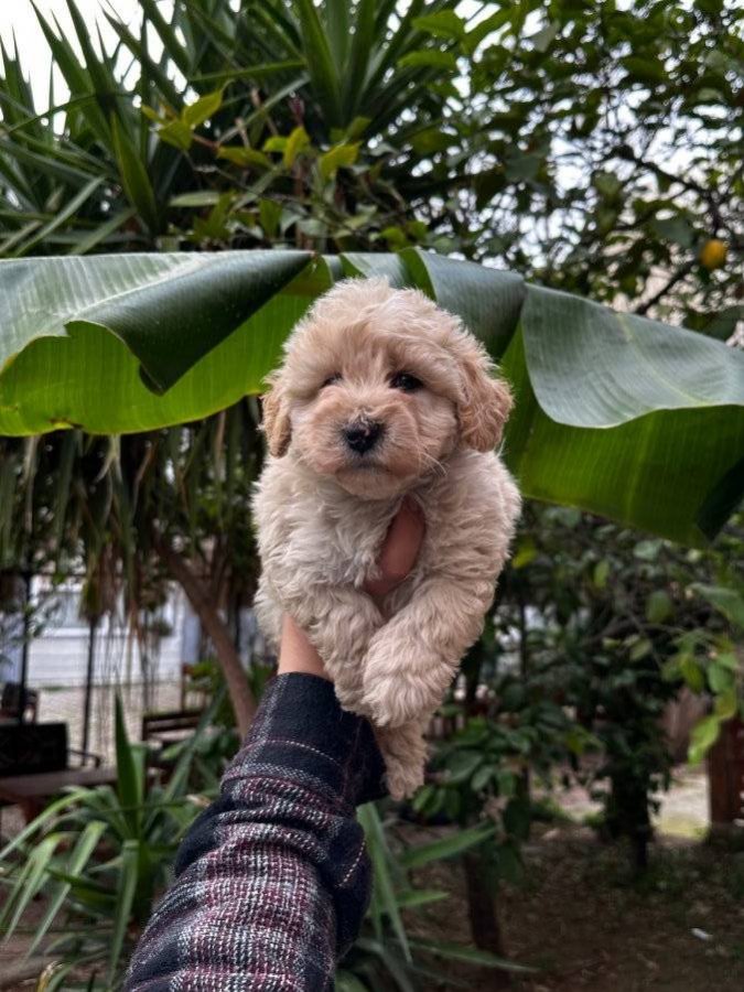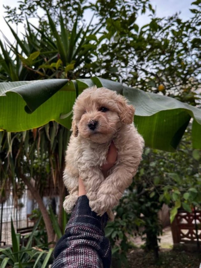 Kore Toy Poodle babadan, Maltes Teriyer anneden 2 aylık bu Maltipoo tam bir tüy yumağı.