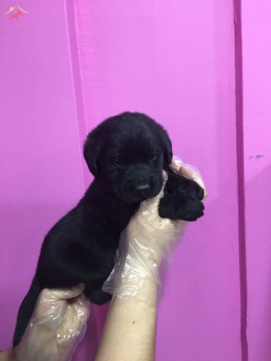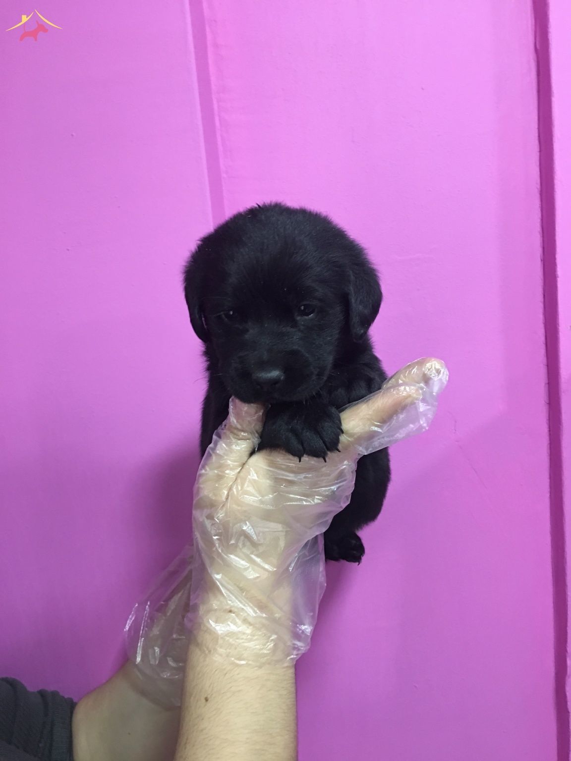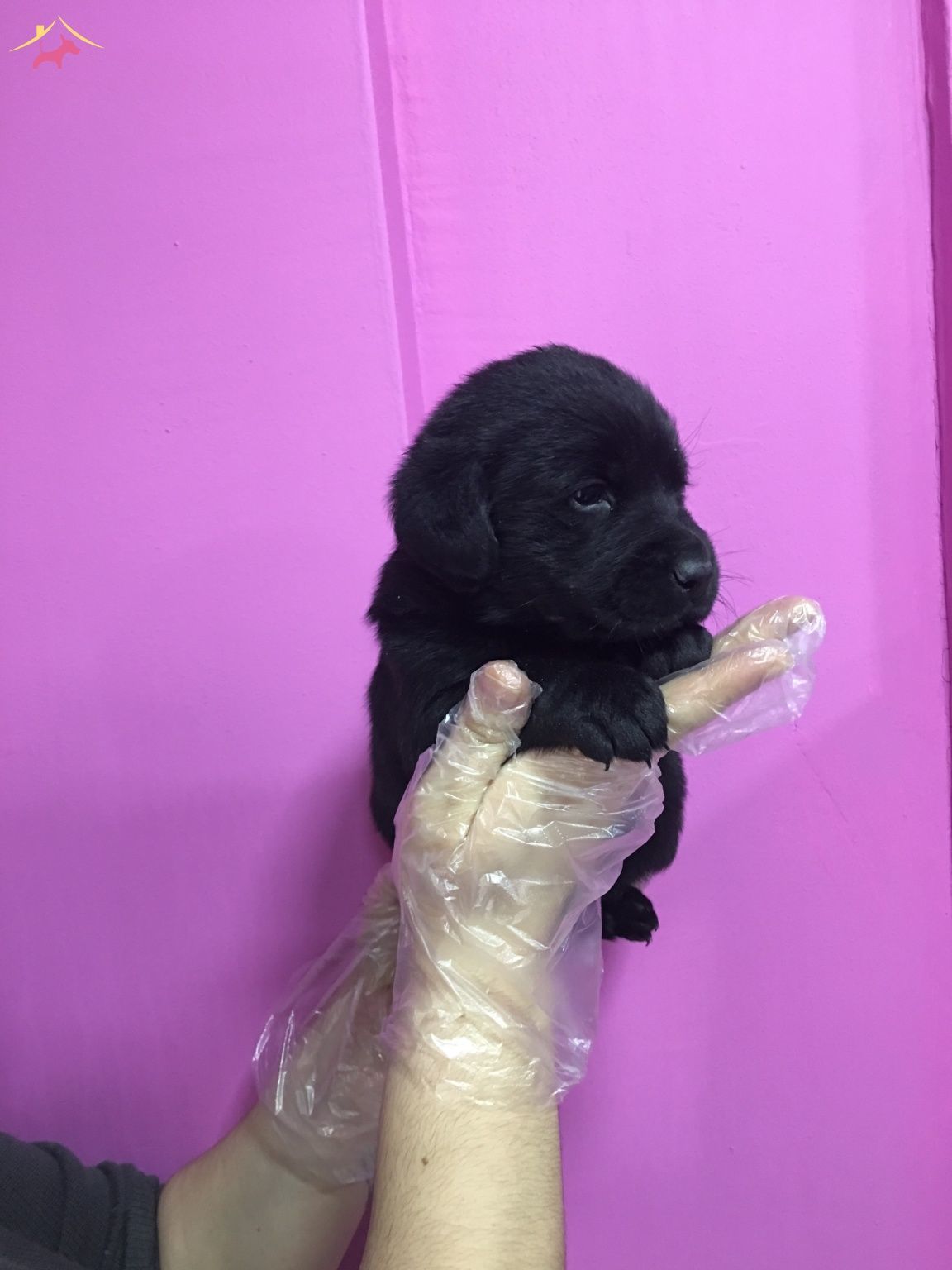 Mor duvar önündeki kadifeye benzeyen siyah tüylü Labrador Retriever yavrularımız çok zeki bebeklerdir.