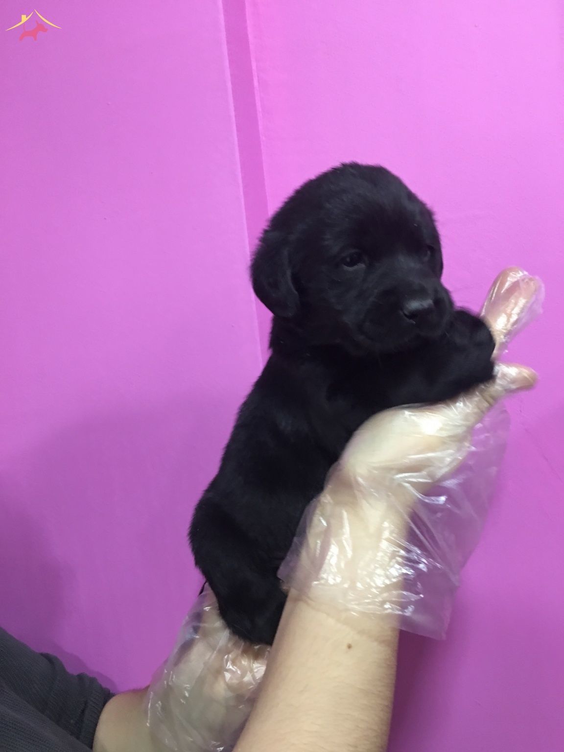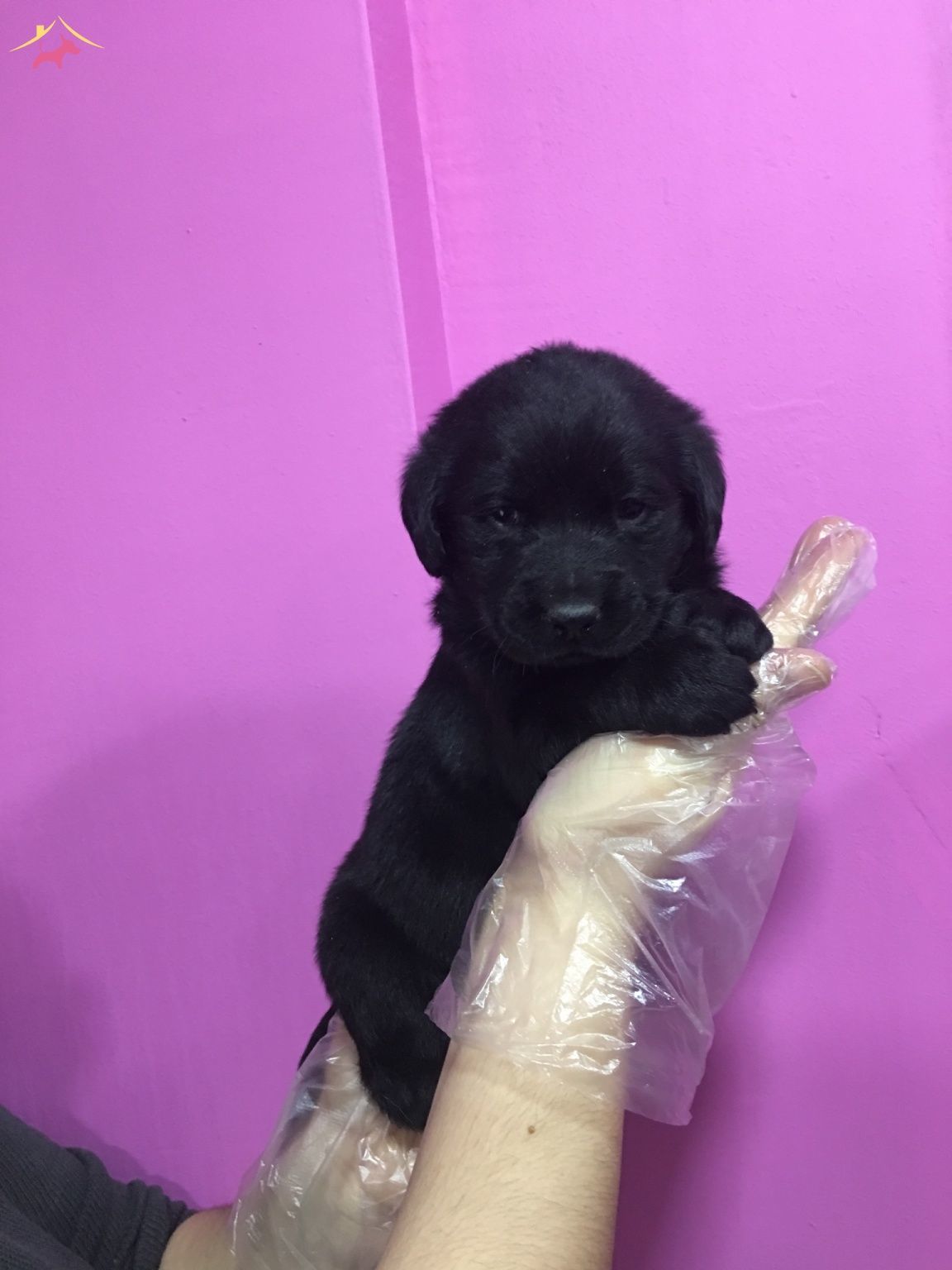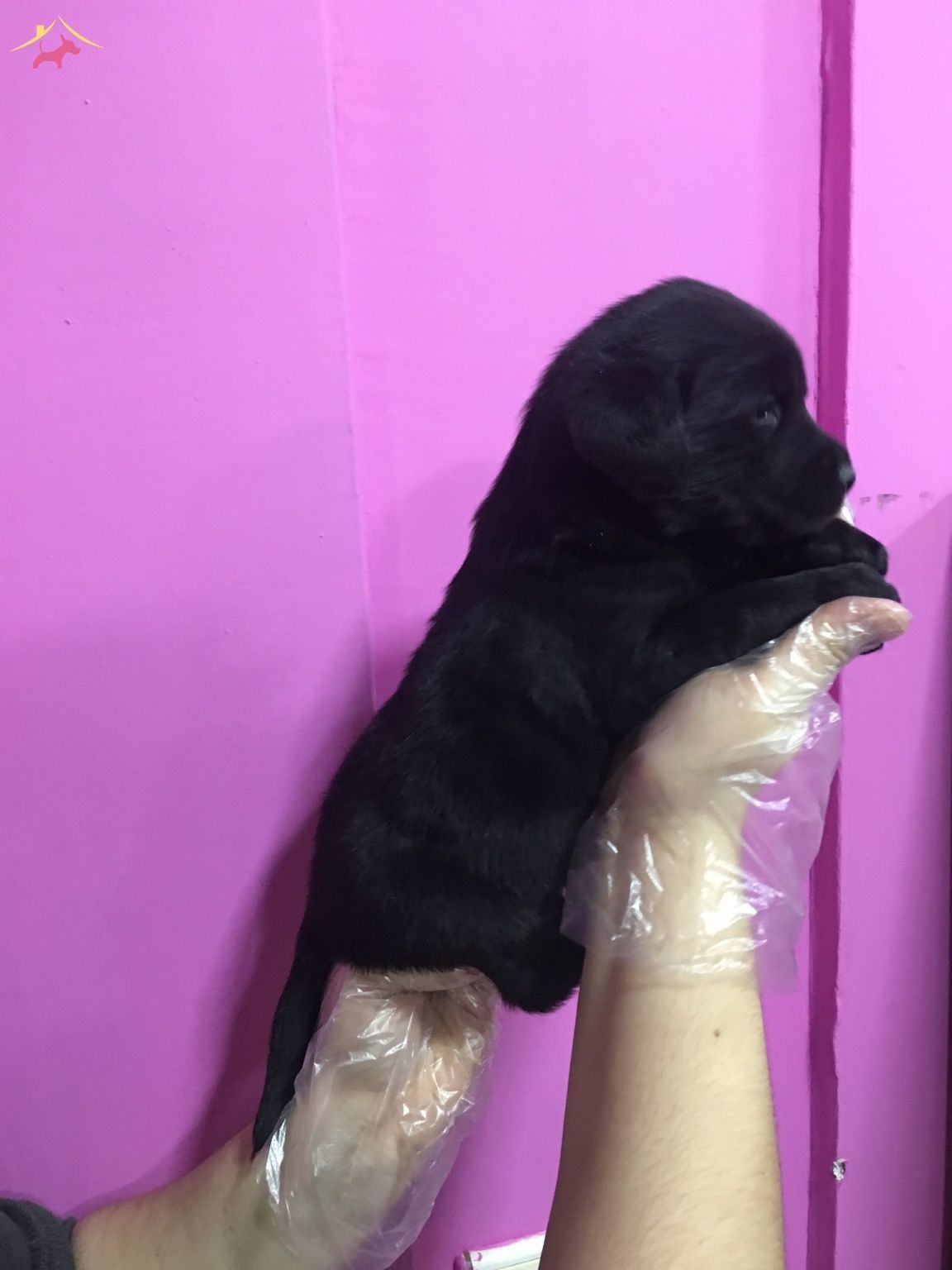 Mor duvar önündeki kadifeye benzeyen siyah tüylü Labrador Retriever yavrularımız çok zeki bebeklerdir.